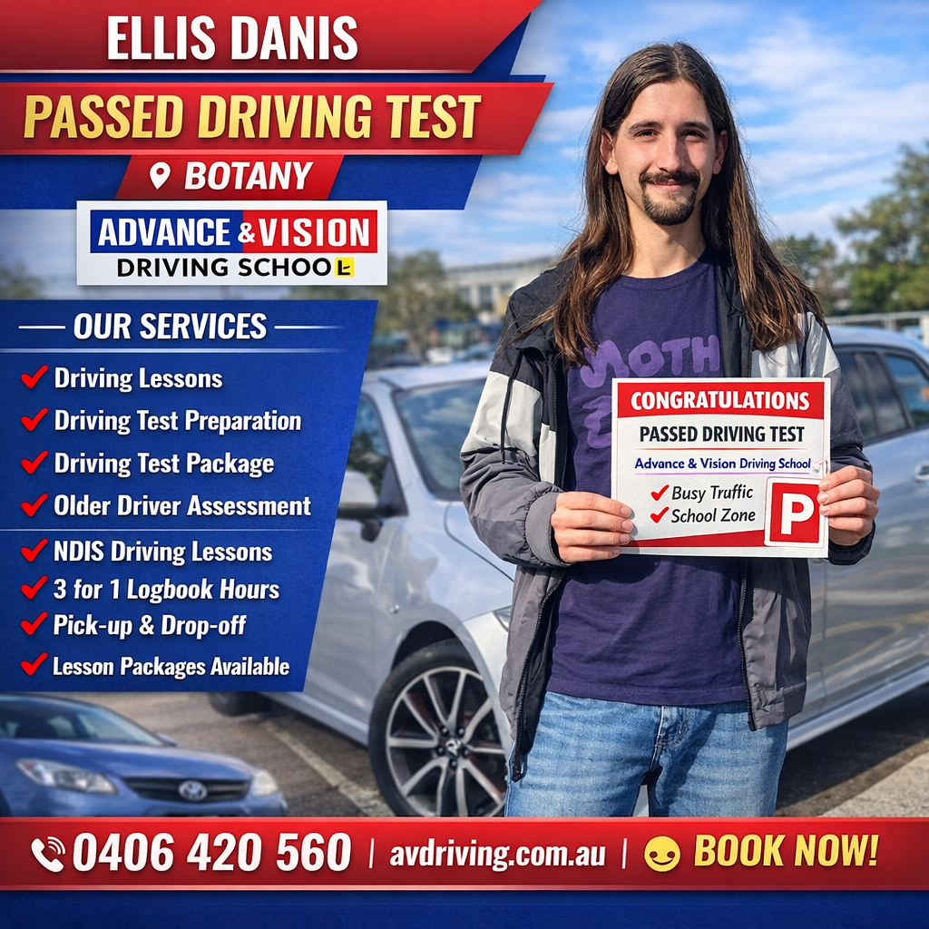 Congratulations to Ellis Danis for successfully passing the driving test at Botany Service NSW. This test was completed in busy traffic and school zone conditions, showing strong driving skills, awareness, and confidence on the road.